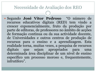 O documento discute a necessidade de avaliação de Recursos Educativos Online (REO) e apresenta os modelos de avaliação utilizados em Portugal pelo Sistema de Avaliação, Certificação e Apoio à Utilização de Software Educativo e Formativo (SACAUSEF). O SACAUSEF avalia os REO considerando cinco domínios: técnico, conteúdo, linguístico, pedagógico e valores/atitudes.