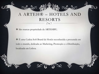 A Arteh é uma cadeia hoteleira soft brand presente em vários países. Sua missão é oferecer experiências de charme, luxo e natureza. A empresa possui um site de comércio eletrônico e presença em redes sociais como Facebook, Twitter e YouTube para interagir com clientes.