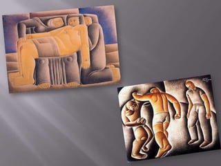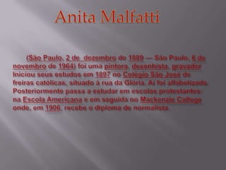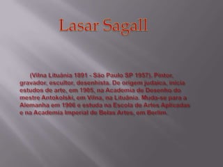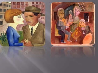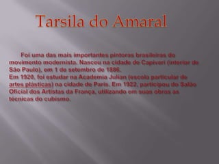 O documento lista 7 obras literárias e 8 pinturas de um artista brasileiro. As obras literárias incluem A Ventania, A Onda, O Farol, O Barco, O homem de sete cores, A boba e A mulher de cabelos verdes. As pinturas listadas são Autorretrato, Retrato de Oswald de Andrade, Estudo (Nú), Natureza-morta com relógios, O Modelo, Caipirinha, Rio de Janeiro e A Feira I.