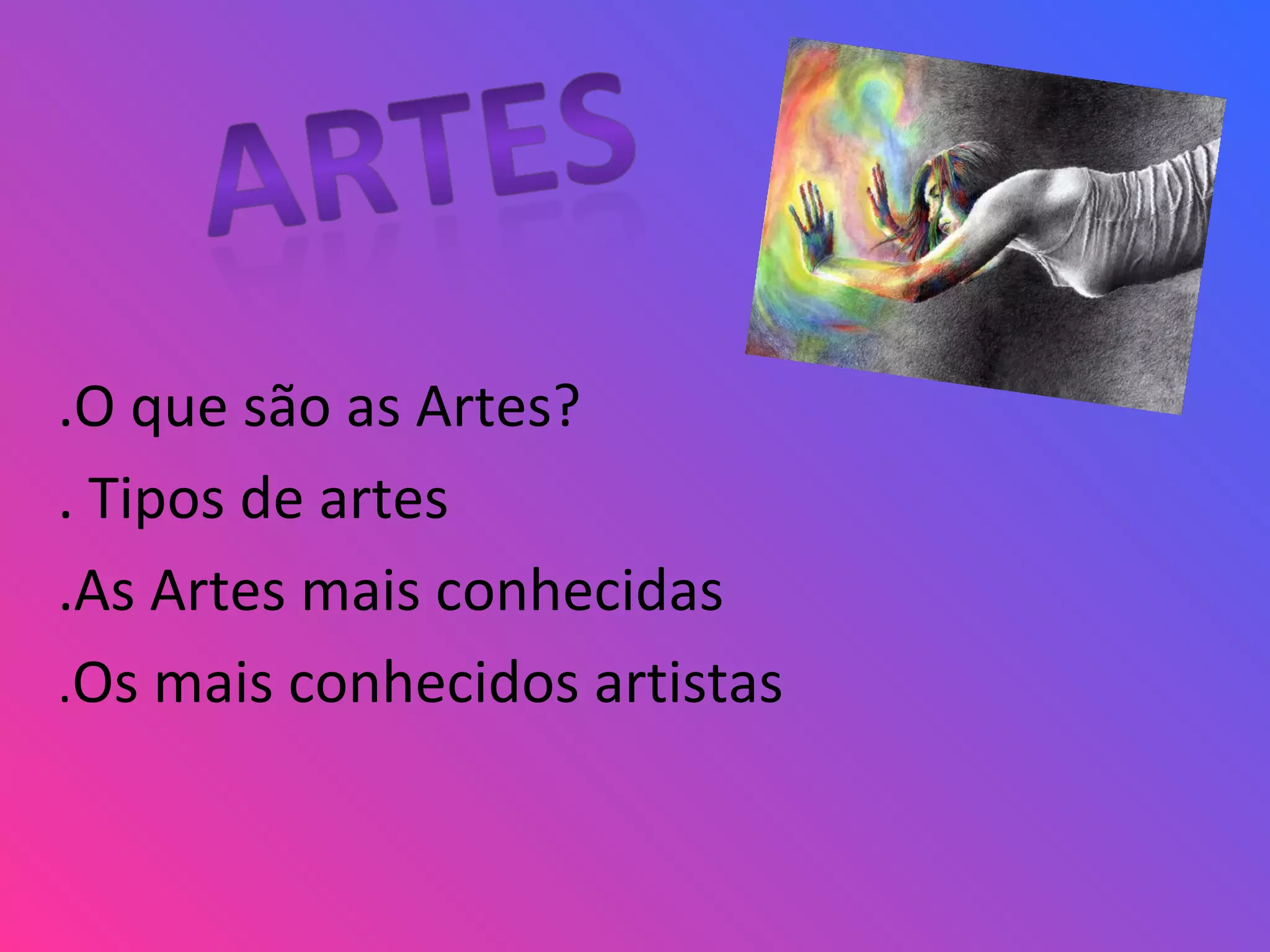 O documento descreve as diferentes formas de arte, incluindo dança, música, pintura, escultura e suas características. Também lista alguns dos artistas mais conhecidos como Michelangelo, Caravaggio, Rembrandt, Picasso, Van Gogh e Dalí.