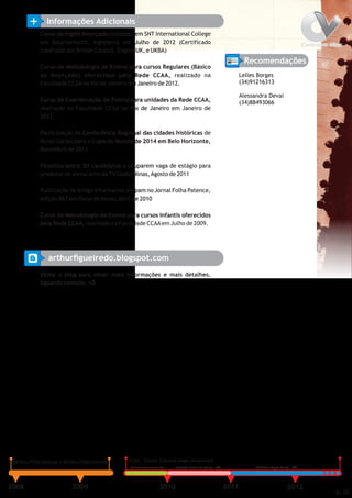 Este currículo apresenta Arthur Figueiredo, um estudante de Comunicação Social que atua como professor de idiomas, designer gráfico e freelancer. Ele possui experiência em ensino de inglês e espanhol, além de habilidades em programas como Photoshop, CorelDraw e Premiere. Seu objetivo é continuar se qualificando na área de comunicação.