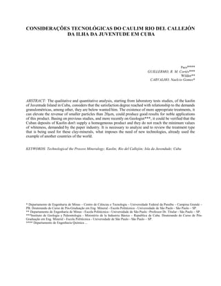 1) O documento analisa as considerações tecnológicas do caulim da Ilha da Juventude em Cuba, incluindo análises de laboratório e caracterização do material.