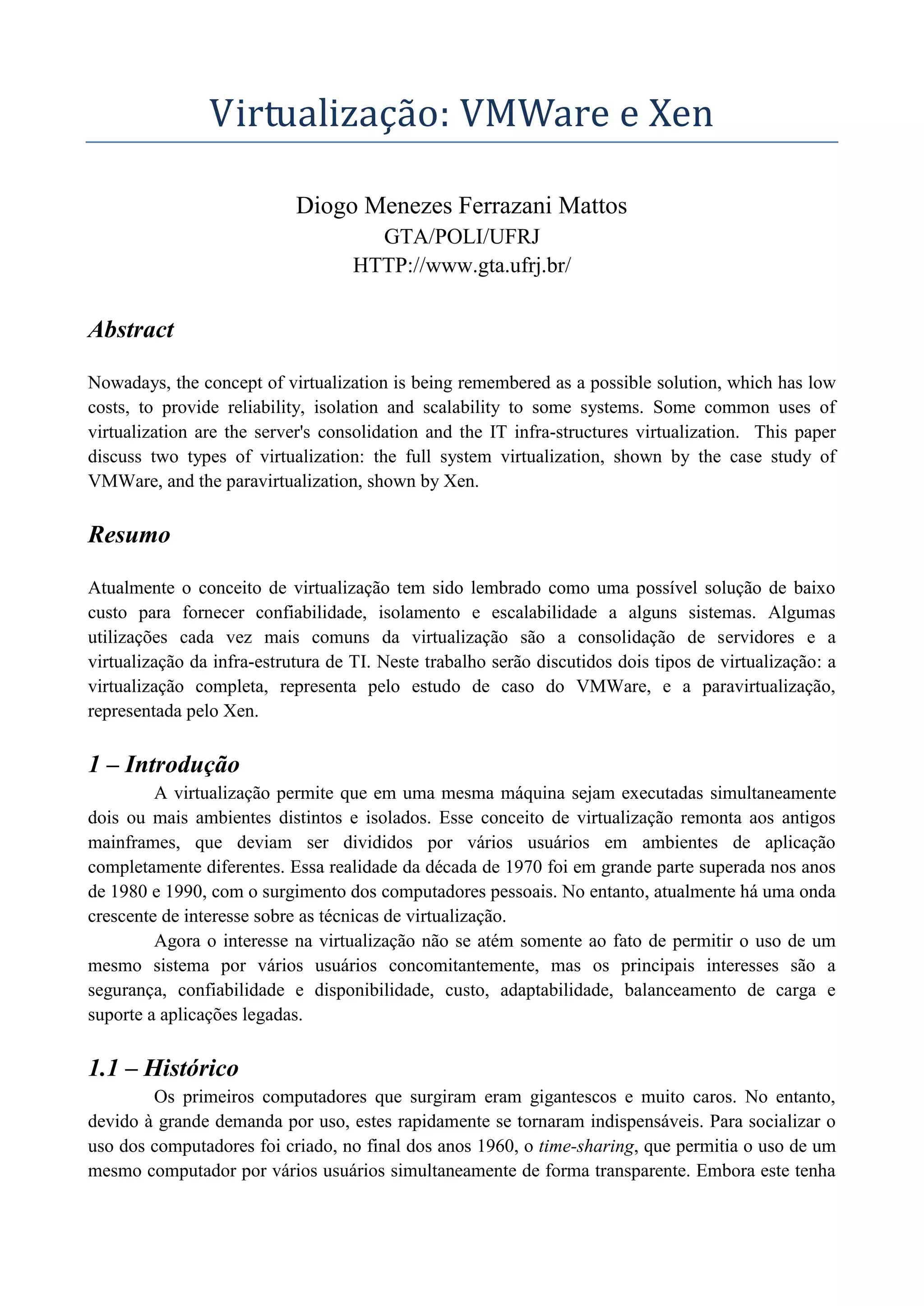 Este documento discute dois tipos de virtualização: a virtualização total, representada pelo VMWare, que fornece uma réplica completa do hardware para o sistema operacional virtual; e a paravirtualização, representada pelo Xen, onde o sistema operacional virtual é modificado para melhor desempenho. A virtualização permite a execução simultânea de múltiplos sistemas operacionais isolados em uma única máquina física através do monitor de máquina virtual (VMM).