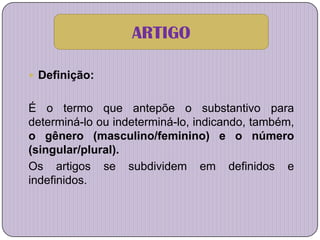 O documento define os artigos definidos e indefinidos em português e discute seu emprego. Os artigos definidos são usados para indicar seres determinados e os indefinidos seres de modo vago. Regras de emprego incluem o uso obrigatório após "ambos", facultativo em nomes próprios e depois de pronomes possessivos.