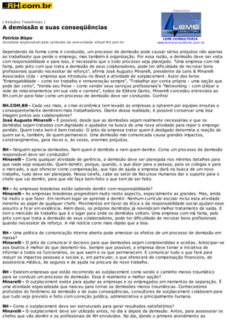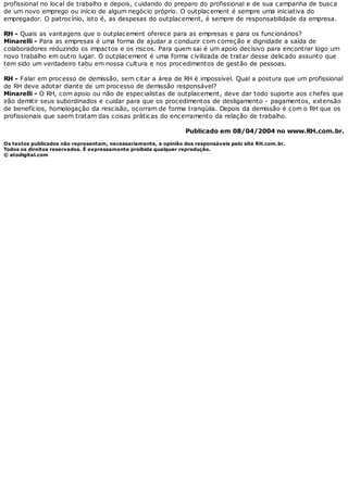 O documento discute como as empresas devem conduzir processos de demissão de forma responsável e menos traumática, incluindo planejamento detalhado, tratamento digno dos demitidos e oferecimento de assistência na busca por novo emprego, por exemplo por meio de programas de outplacement. O especialista José Augusto Minarelli defende que demissões mal conduzidas prejudicam a imagem da empresa e dificultam futuros recrutamentos.