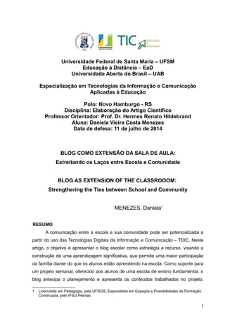 O documento descreve uma experiência em que um blog escolar foi utilizado para estreitar os laços entre a escola e a comunidade. O blog antecipava o planejamento semanal de projetos para os alunos e apresentava os conteúdos trabalhados, permitindo que os alunos chegassem às aulas mais preparados e compartilhassem suas aprendizagens com as famílias. No entanto, observou-se a necessidade de investir na alfabetização digital nas escolas para que o blog pudesse ser usado em todo o seu potencial.