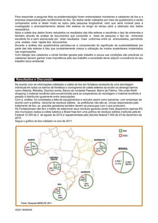 Este documento analisa a coleta seletiva de lixo em Fortaleza e o nível de conhecimento dos moradores e catadores sobre sua importância. Pesquisas com questionários revelaram que há pouca conscientização e divulgação dos programas de coleta seletiva. Um projeto educacional foi elaborado para melhorar este cenário e promover a sustentabilidade.