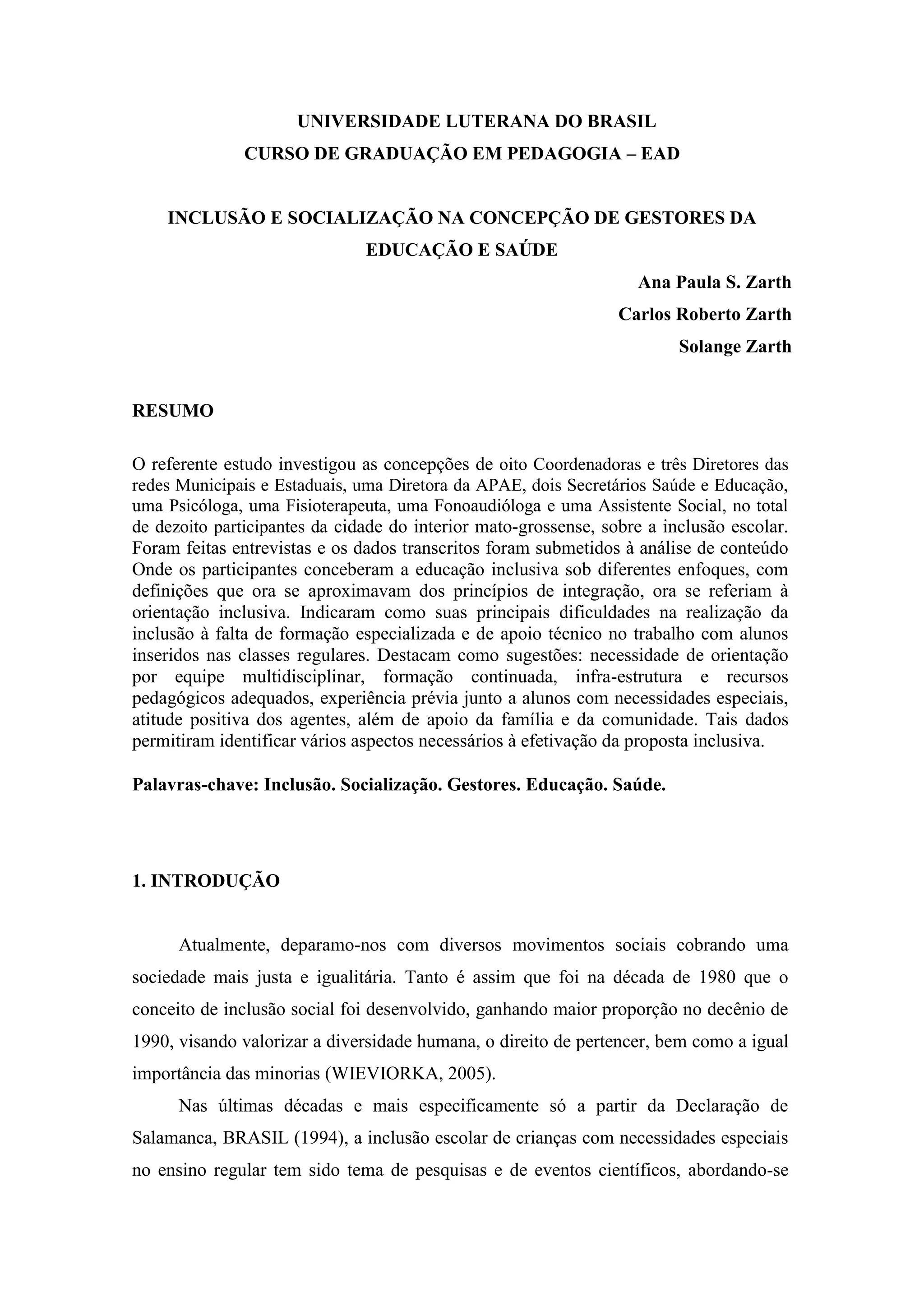 1) O documento descreve uma pesquisa sobre as concepções de gestores da educação e saúde sobre inclusão escolar em uma cidade do Mato Grosso.