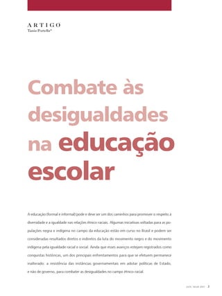 O documento discute a Lei 10.639/03, que torna obrigatório o ensino da história e cultura africana e afro-brasileira nas escolas brasileiras. A lei foi resultado das lutas do movimento negro por décadas para combater a desigualdade racial na educação. O texto explica os detalhes da lei e seu processo de regulamentação, além de destacar a importância contínua do movimento negro para garantir sua implementação.