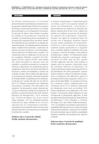 O estudo avaliou a qualidade da produção de refeições em 22 restaurantes de Cerqueira César, São Paulo usando um questionário baseado na legislação sanitária. Os restaurantes receberam notas ruins, com 91% classificados como deficientes e 9% como regulares. As piores pontuações foram para Boas Práticas de Fabricação (9,2%) e as melhores para Controle de Pragas (71%). Os resultados mostram a baixa qualidade dos serviços oferecidos e a necessidade de melhorias na higiene sanitária.