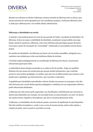 1) O documento discute os conceitos de diferenciação, inclusão e exclusão na educação, argumentando que diferenciar para incluir requer garantir o direito à diferença e à igualdade de cada estudante.