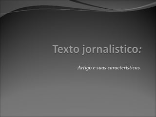 O documento descreve as características e estrutura de um artigo jornalístico. Um artigo é opinativo e pessoal, comentando fatos ou sugerindo reflexões, diferente de um editorial que representa a opinião do veículo. Um artigo deve ter título, introdução, corpo com blocos de argumentação e discussão do tema, e conclusão.