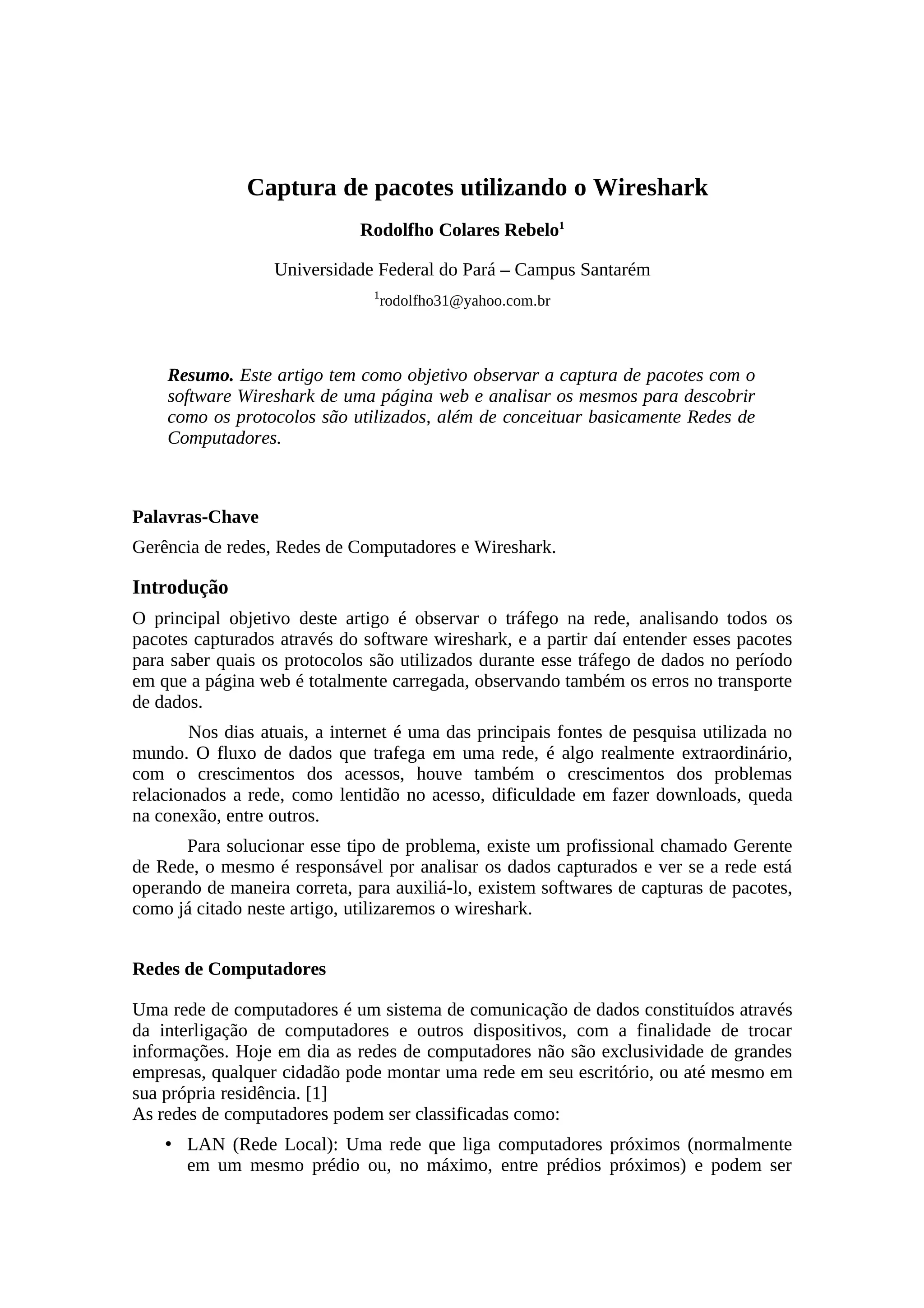 Este documento descreve como o software Wireshark pode ser usado para capturar pacotes de rede e analisar os protocolos utilizados durante o carregamento de uma página da web. Ele explica brevemente conceitos básicos de redes de computadores e protocolos como ARP, HTTP, TCP e UDP. O autor realizou um experimento capturando pacotes durante o carregamento de uma página e analisou os protocolos observados, como ARP, HTTP e TCP.