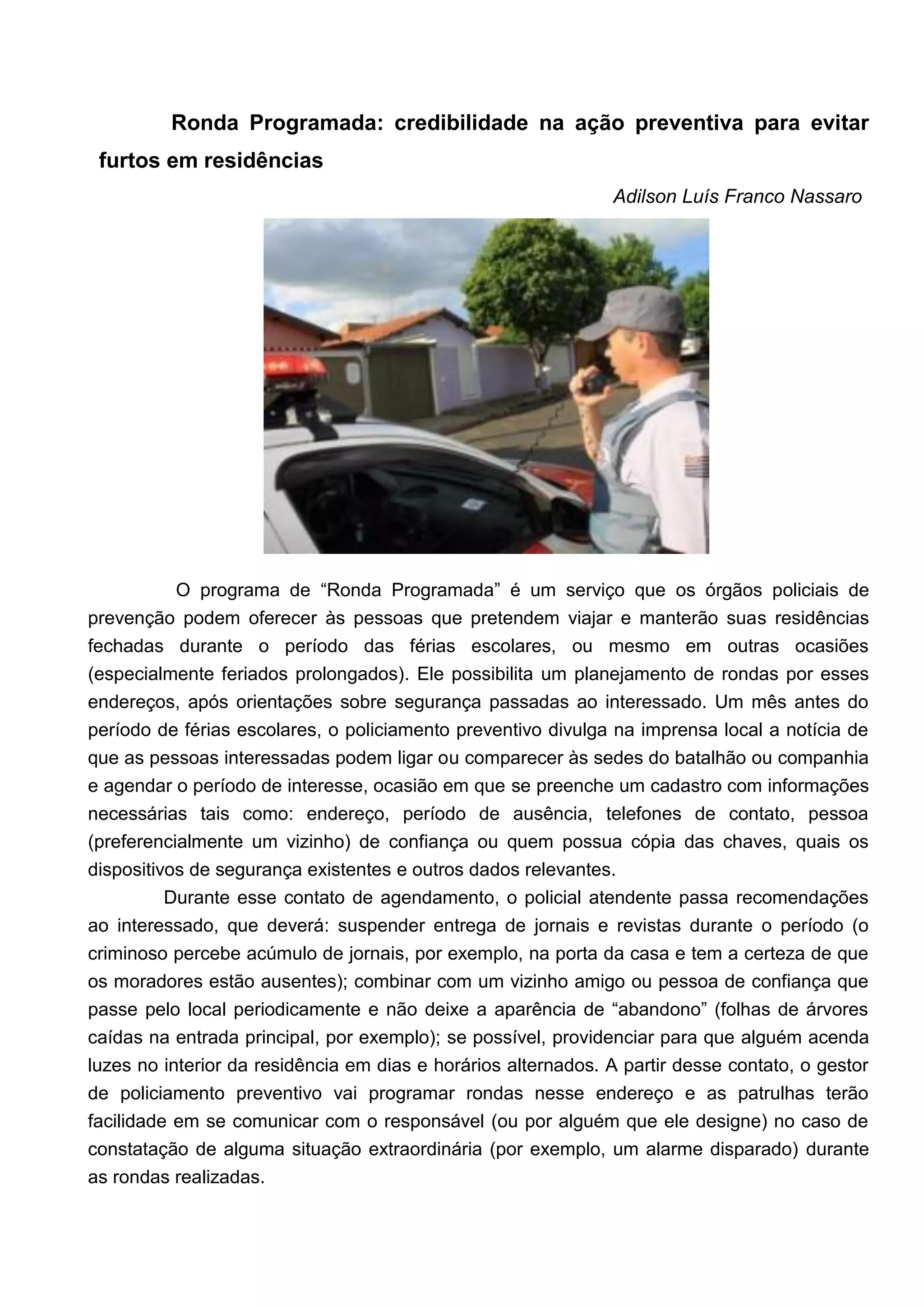 O documento descreve o programa "Ronda Programada" da polícia, que realiza rondas planejadas em residências vazias durante feriados para prevenir furtos. Os proprietários cadastram seus endereços e recebem orientações de segurança. As patrulhas programam rondas nesses locais e podem se comunicar com contatos em caso de emergências. O programa teve grande sucesso, reduzindo furtos em cidades da região central-oeste de São Paulo.