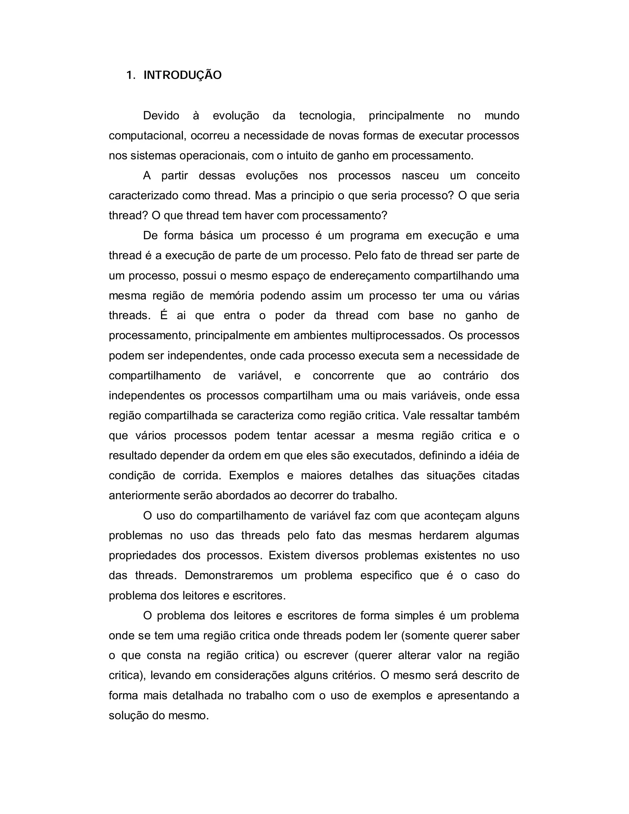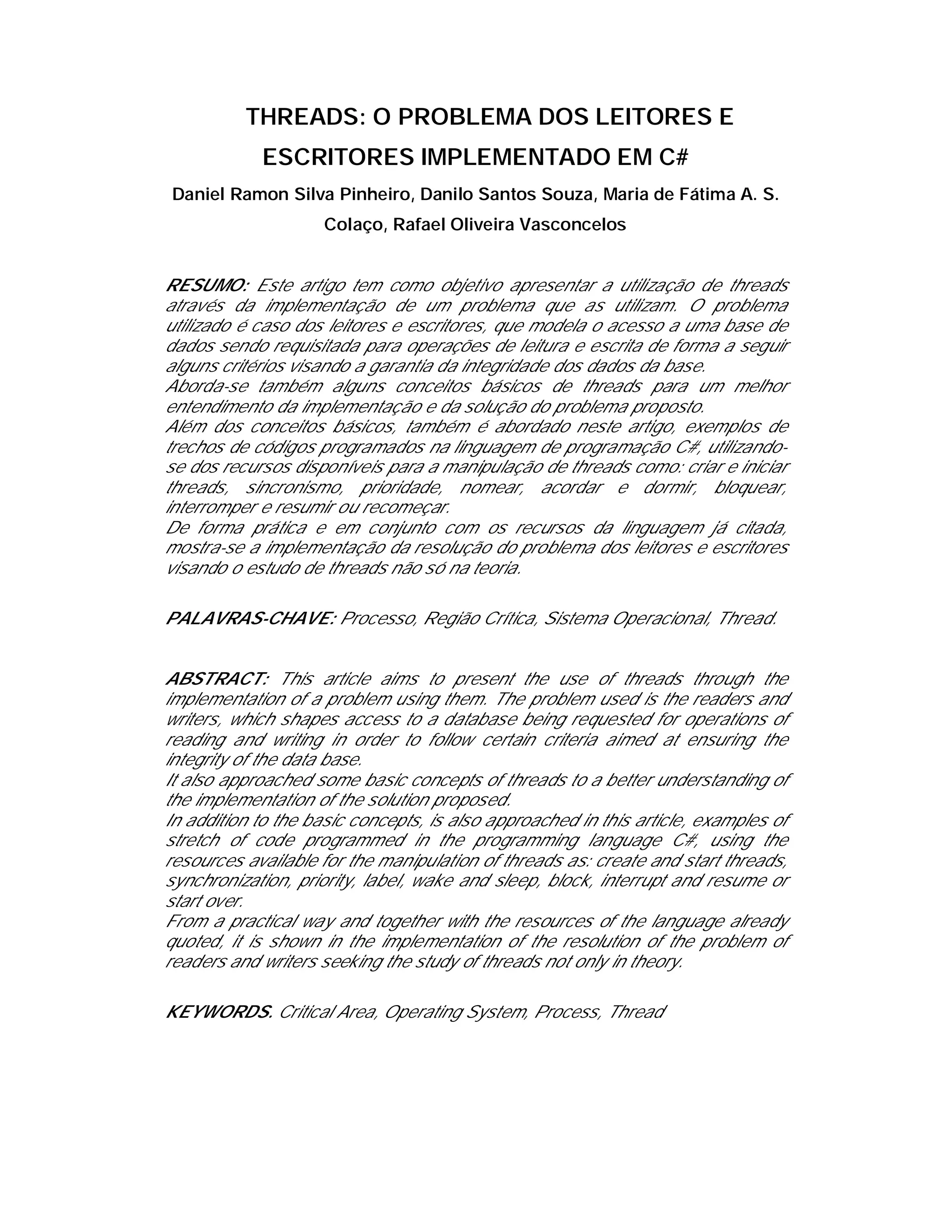 1) O documento discute a implementação do problema dos leitores e escritores usando threads no C#. 2) O problema envolve threads que podem ler ou escrever em uma região crítica de dados, seguindo certos critérios para garantir a integridade dos dados. 3) O artigo explica conceitos básicos de threads e fornece exemplos de código C# para criar, sincronizar e manipular threads.