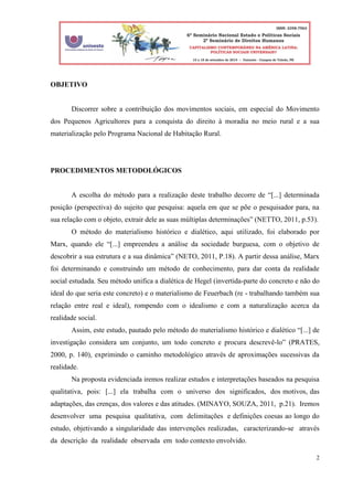 O documento discute a conquista do direito à moradia no meio rural através do Programa Nacional de Habitação Rural no Brasil. Apresenta a concepção de direitos humanos como construção histórica e social e destaca o papel dos movimentos sociais, especialmente o Movimento dos Pequenos Agricultores, na luta pela implementação de políticas públicas que atendam às necessidades da população rural, como o direito à moradia.