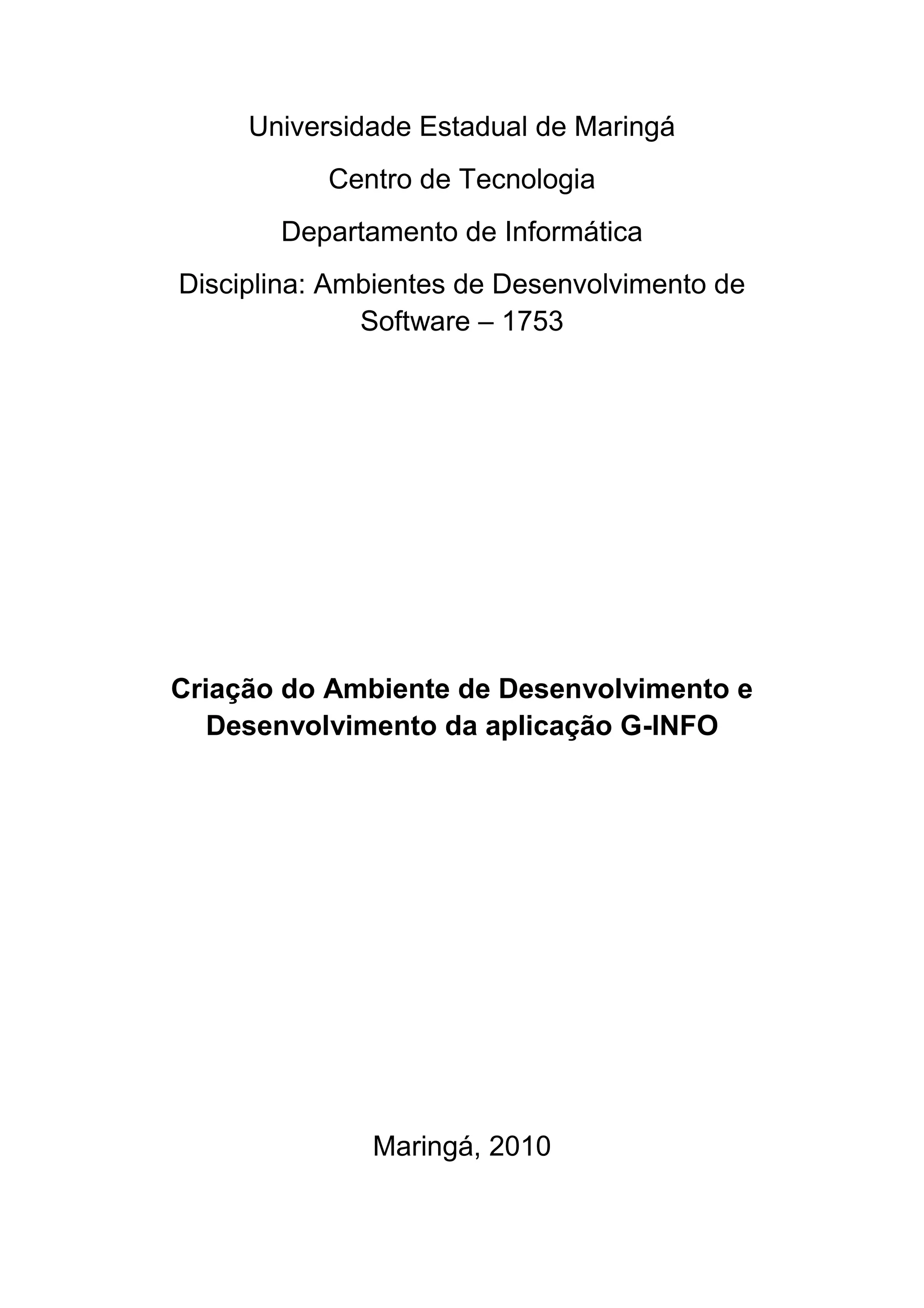 O documento descreve o desenvolvimento de um sistema de gestão de informações chamado G-INFO usando Scrum. Detalha a criação de um ambiente de desenvolvimento com ferramentas como NetBeans, Grails e Visual Paradigm e o desenvolvimento do sistema com base nos requisitos levantados e nos diagramas de classe e banco de dados. Conclui que os objetivos de criar o ambiente e sistema foram alcançados e a qualidade do software desenvolvido foi assegurada.