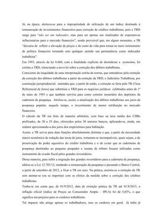O documento discute a atualização monetária dos créditos trabalhistas após a extinção da Taxa Referencial (TR). Anteriormente, os créditos eram atualizados pela TR, mas ela foi extinta em 2012 sem uma alternativa. O documento defende que o Índice Nacional de Preços ao Consumidor (INPC) é o índice mais adequado para preservar o poder de compra dos créditos, conforme decisões judiciais.