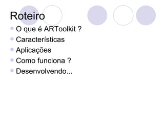 O documento descreve o ARToolkit, uma biblioteca open source para desenvolvimento de realidade aumentada. Ele funciona capturando imagens da câmera, identificando marcadores nelas e sobrepondo objetos 3D de forma precisa. Exemplos de aplicações são a sobreposição de objetos virtuais em cartões reais e interação com propriedades dos marcadores.