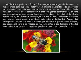 Os artrópodes são caracterizados principalmente por suas patas articuladas e exoesqueleto externo. Eles são o filo mais diversificado do planeta e incluem insetos, crustáceos e aracnídeos. Os artrópodes respiram através de brânquias, traquéias ou pulmões e realizam a troca de exoesqueleto durante o crescimento.