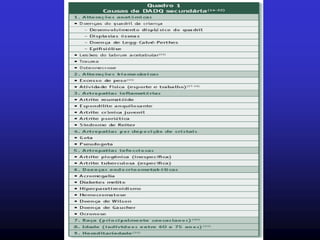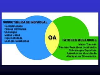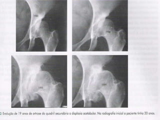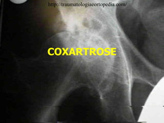 A coxartrose é uma doença degenerativa crônica caracterizada pela deterioração da cartilagem do quadril, que afeta principalmente idosos e causa dor, limitação da mobilidade e déficit funcional. O tratamento objetiva eliminar a dor e melhorar a função, podendo ser conservador com fisioterapia e anti-inflamatórios ou cirúrgico com osteotomias ou artroplastia total do quadril.