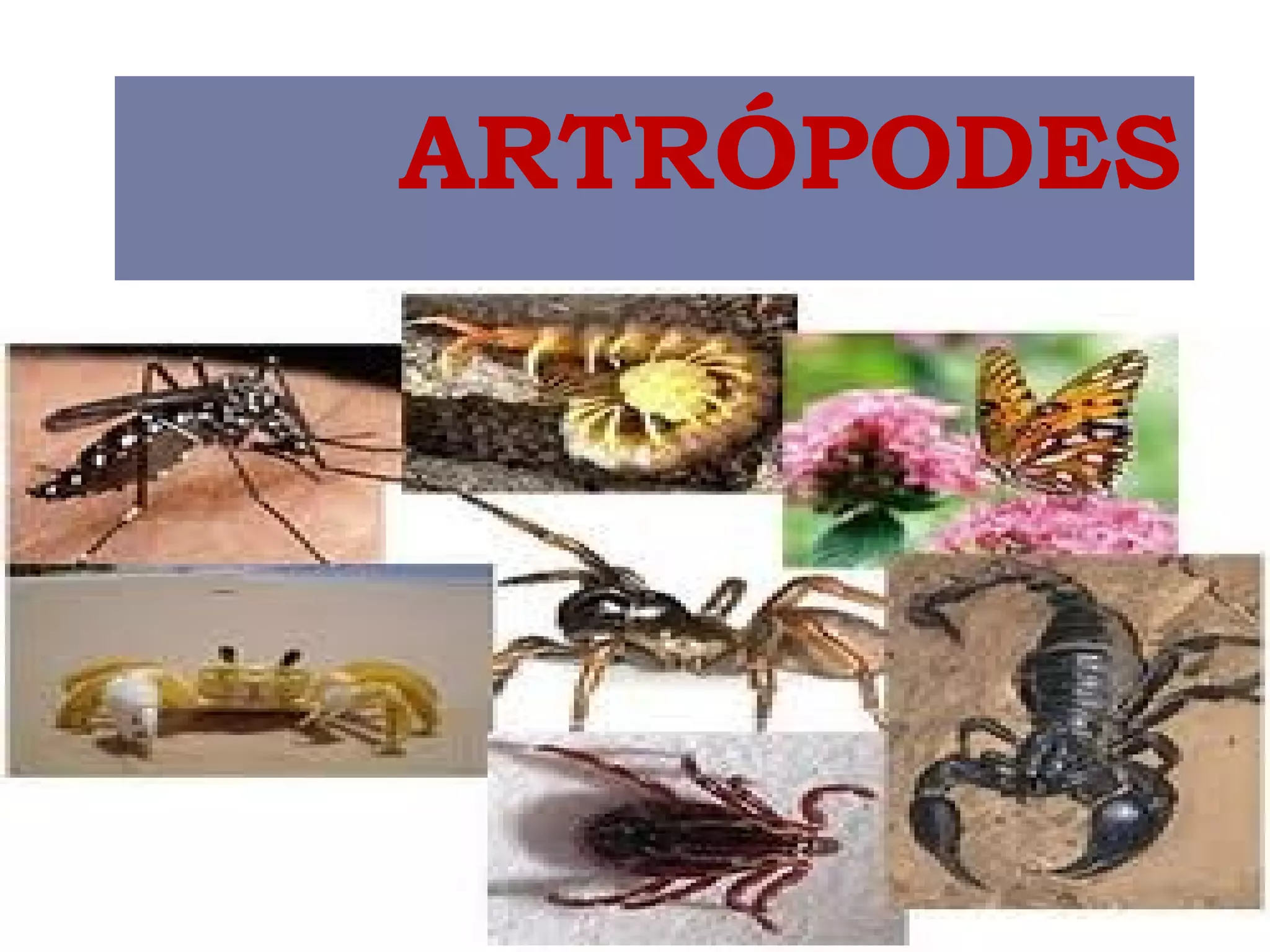 O documento descreve as principais características dos artrópodes. Eles são invertebrados com membros articulados e exoesqueleto quitinoso, incluindo insetos, crustáceos e aracnídeos. Os insetos são a classe mais diversa e têm corpo dividido em cabeça, tórax e abdômen. Os crustáceos são predominantemente aquáticos e marinhos, com exoesqueleto calcário. As aranhas, escorpiões e ácaros pertencem à classe aracnídeos.