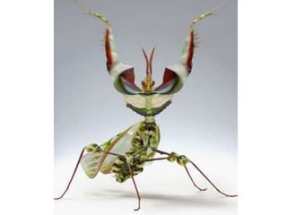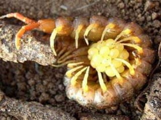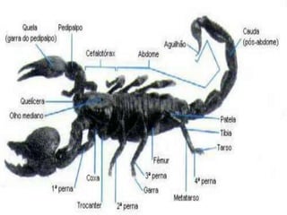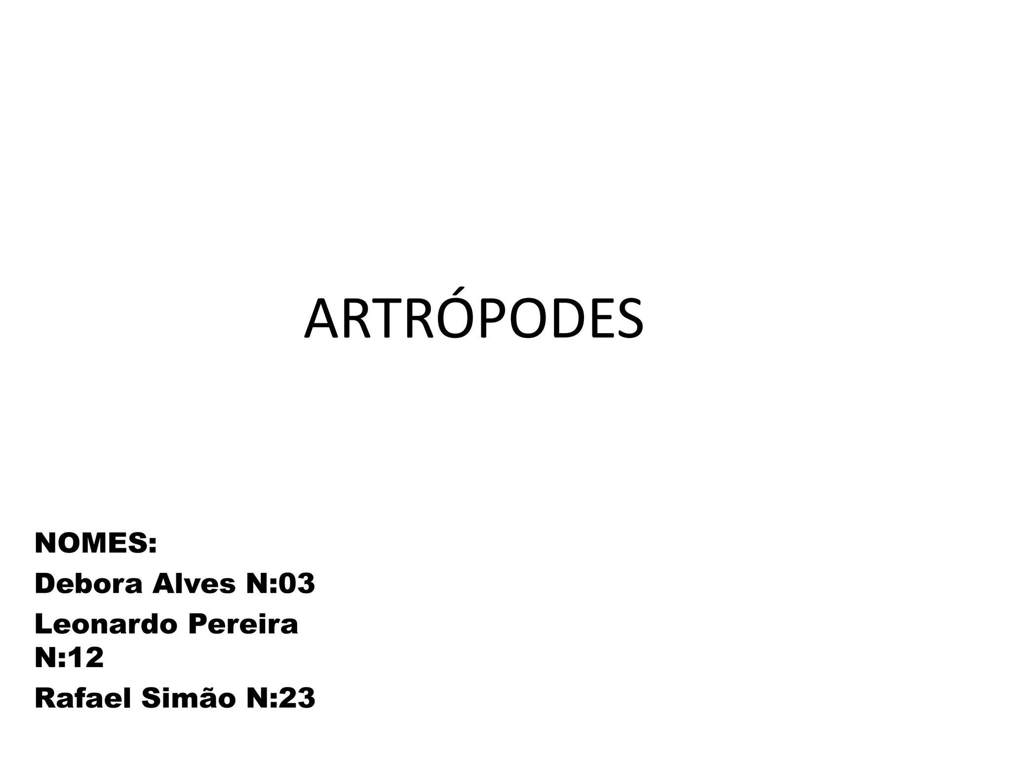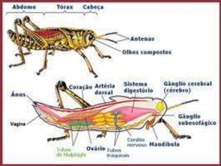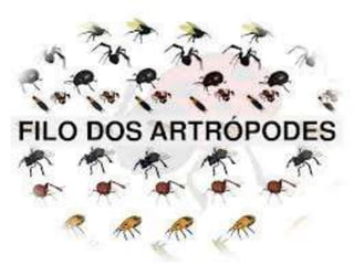 O documento fornece informações sobre os principais grupos de artrópodes. Resume suas características gerais e exemplos de cada classe, incluindo: Insetos como baratas e mosquitos; Crustáceos como camarões e siris; e Aracnídeos como aranhas e escorpiões. Também discute quilópodes e diplópodes, notando suas diferenças no número de patas.