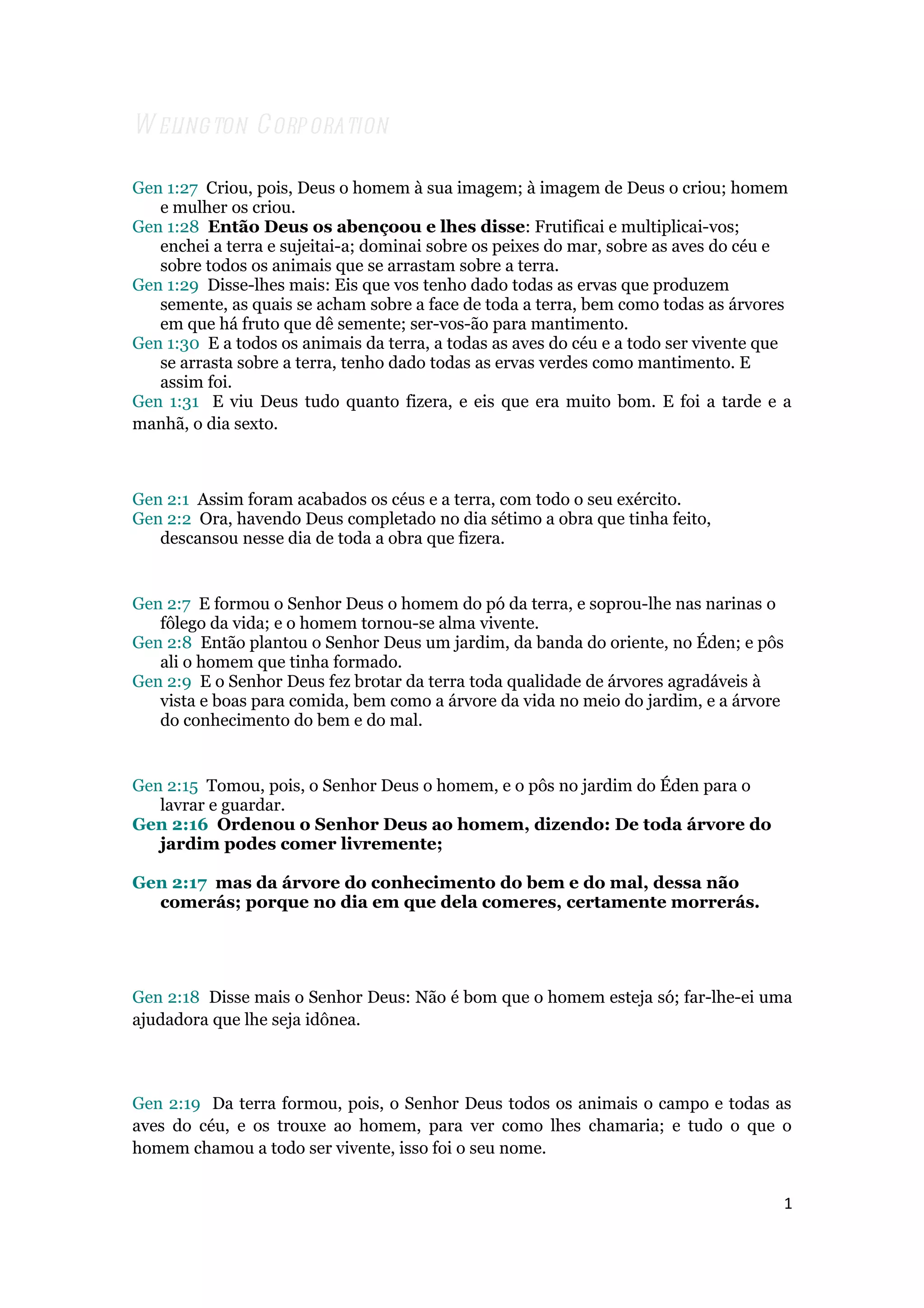 1) O documento descreve os primeiros capítulos do Gênesis, narrando a criação do homem e da mulher por Deus, a instituição do casamento e a proibição de comer do fruto da árvore do conhecimento do bem e do mal. 2) A serpente engana Eva, dizendo que ela não morrerá se comer o fruto, e Eva come o fruto e dá para Adão. 3) Deus pune a serpente, Eva, Adão e expulsa o homem do Jardim do Éden.