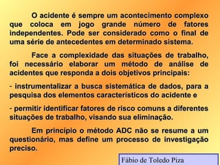O documento descreve o Método de Análise de Causas de Acidentes (ADC), que consiste em construir uma árvore de causas a partir de um acidente. O método busca identificar os fatores de risco analisando as condições permanentes e as variações que ocorreram durante o trabalho. A investigação deve coletar dados logo após o acidente e reconstruir a sequência de eventos que levaram ao acidente.