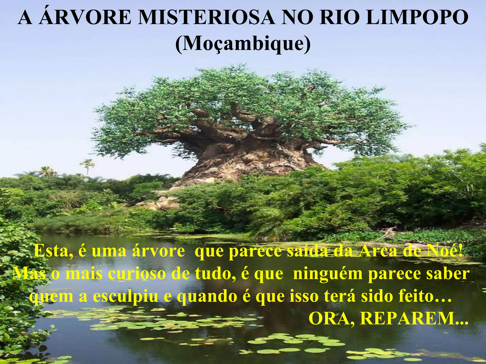 A ÁRVORE MISTERIOSANO RIO LIMPOPO (Moçambique) Esta, é uma árvore que parece saída da Arca de Noé! Mas o mais curioso de tudo, é que ninguém parece saber quem a esculpiu e quando é que isso terá sido feito… ORA, REPAREM...