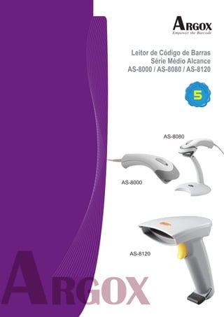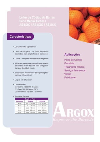 O documento descreve três leitores de código de barras da série médio alcance da Argox: o AS-8000, o AS-8080 e o AS-8120. O AS-8000 é um scanner leve e prático para varejo. O AS-8080 possui as mesmas especificações que o AS-8000. O AS-8120 oferece bom desempenho a um preço acessível, lendo códigos de barras por contato até 150mm.