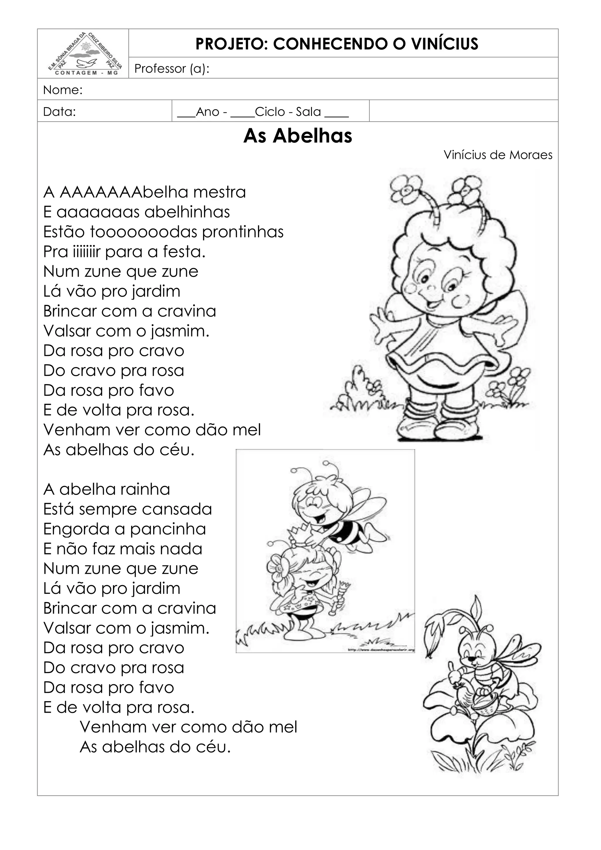 Este documento descreve uma poesia de Vinícius de Moraes sobre abelhas e fornece atividades relacionadas ao texto poético. O documento inclui perguntas sobre o significado de palavras usadas na poesia, um convite de festa para abelhinhas e informações sobre abelhas.