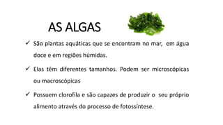 As algas são plantas aquáticas que variam de tamanho, desde microscópicas a macroscópicas. Elas contêm clorofila e produzem seu próprio alimento através da fotossíntese. As algas são encontradas no mar, água doce e regiões úmidas e desempenham um papel importante na cadeia alimentar e produção de oxigênio na Terra.