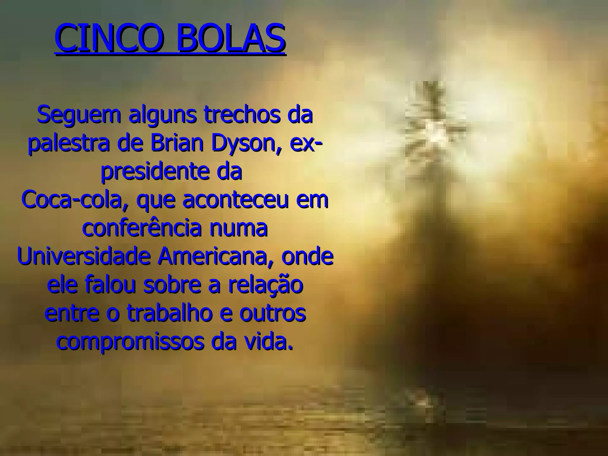 O documento resume a palestra de Brian Dyson sobre equilibrar as cinco esferas da vida: trabalho, família, saúde, amigos e espírito. Ele sugere que o trabalho é flexível, mas as outras esferas são frágeis e precisam de atenção para evitar danos permanentes. A mensagem central é buscar equilíbrio entre as responsabilidades e valorizar as relações e o presente momento.