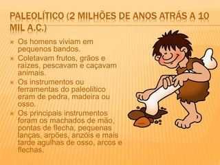 O documento descreve as conquistas da Pré-história, dividindo-a em Paleolítico e Neolítico. No Paleolítico, os humanos viviam em bandos, caçavam e coletavam alimentos, usavam ferramentas de pedra e osso, vestiam peles e produziam fogo. Eles também deixaram pinturas rupestres em cavernas. No Neolítico, a agricultura e criação de animais permitiram que os grupos se tornassem sedentários, vivendo em povoados fixos.