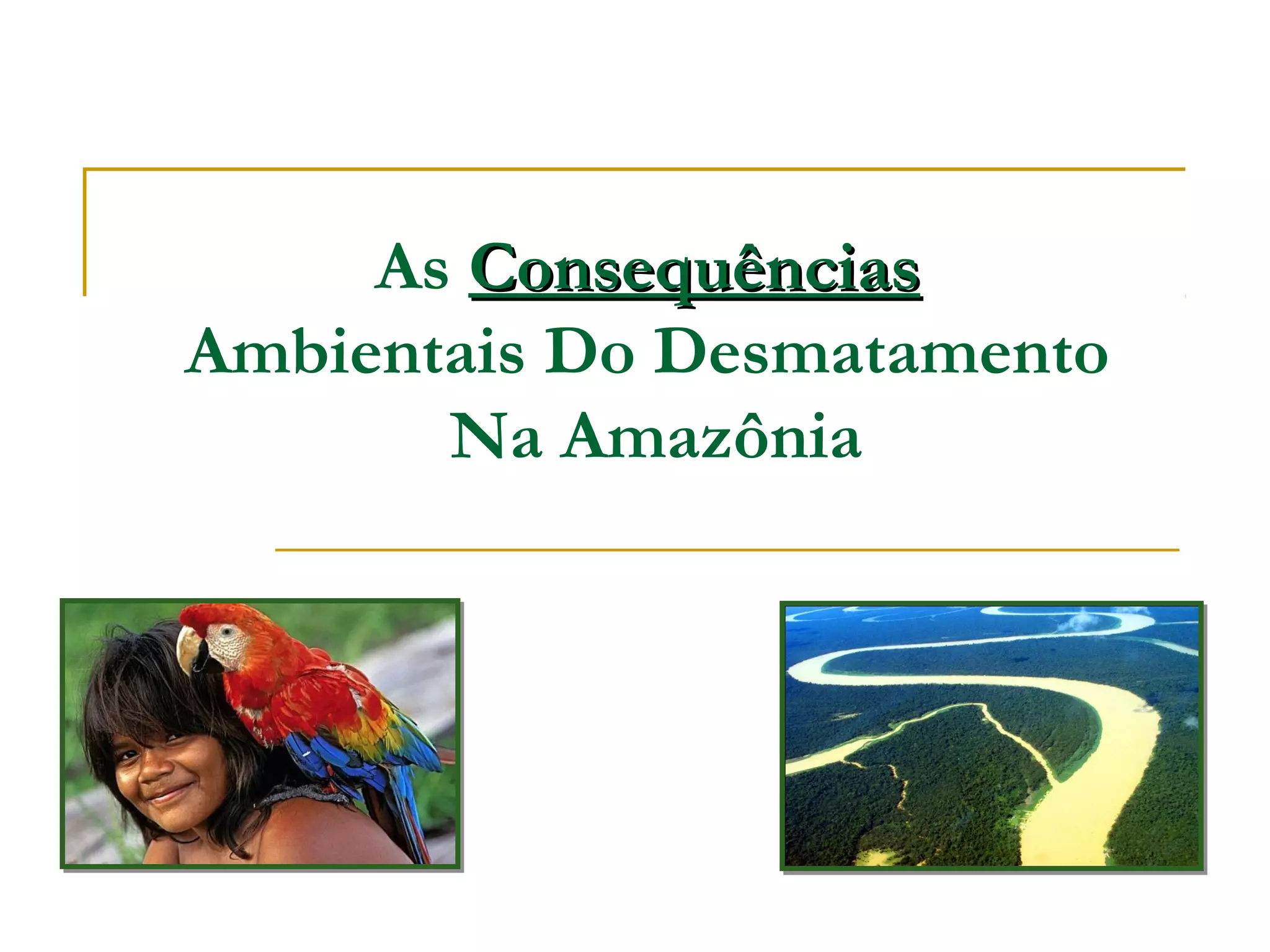O documento discute as consequências ambientais do desmatamento na Amazônia, incluindo a destruição da biodiversidade, genocídio de povos indígenas, erosão dos solos, enchentes, elevação de temperaturas, desertificação, e proliferação de doenças. O desmatamento é causado principalmente pela extração madeireira, queimadas, expansão da agricultura e pecuária. A preservação da Amazônia é crucial para o futuro do planeta.