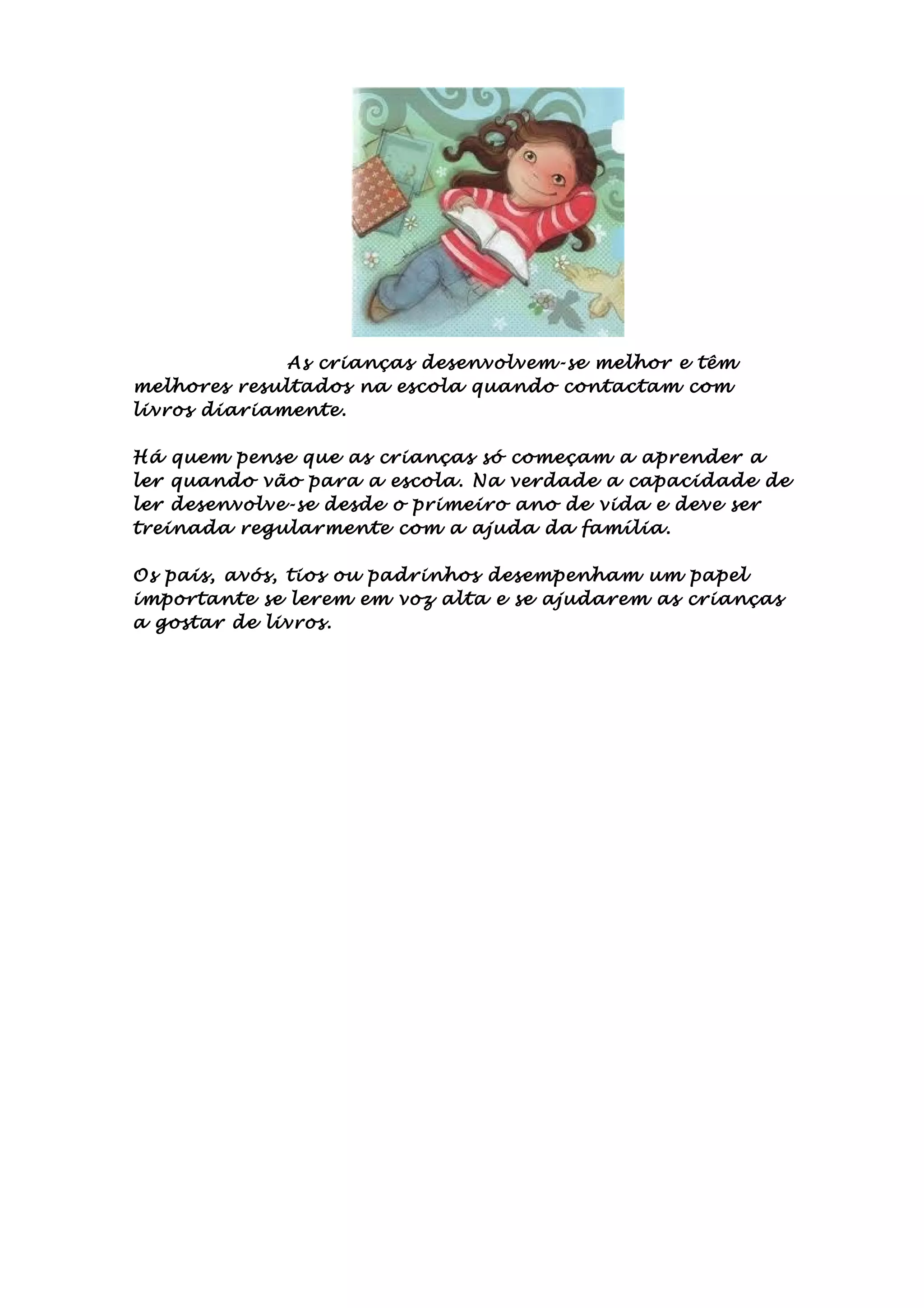 Crianças se desenvolvem melhor quando lêem livros diariamente, pois sua capacidade de ler se desenvolve desde o primeiro ano e deve ser treinada regularmente com a ajuda da família, que desempenha um papel importante lendo em voz alta e ajudando as crianças a gostar de livros.