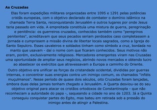 As Cruzadas foram expedições militares lançadas entre 1095 e 1291 pela Igreja Católica com o objetivo de reconquistar os locais sagrados de Jerusalém e outros territórios da Terra Santa sob domínio muçulmano. Ao longo de quase dois séculos, oito Cruzadas foram lançadas com diferentes graus de sucesso, mas não conseguiram manter o controle permanente sobre a região.