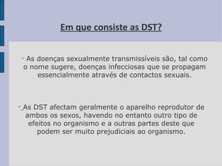 As DST são doenças transmitidas sexualmente causadas por vírus, bactérias e parasitas que afetam principalmente o aparelho reprodutor. Podem causar distúrbios emocionais, doença inflamatória pélvica, infertilidade, lesões fetais e facilitar a transmissão do HIV. Exemplos de DST incluem HIV/AIDS, hepatite B, herpes genital, HPV, gonorreia e sífilis.