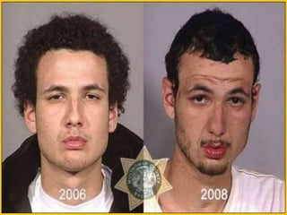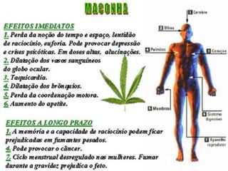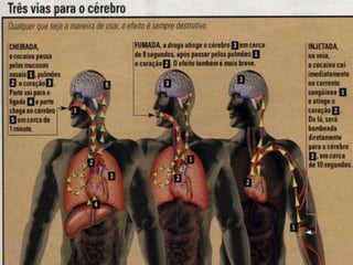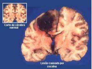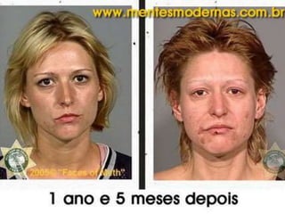 O documento discute os perigos do vício em drogas, com foco no crack. Apresenta estatísticas sobre o uso de cocaína no Brasil e descreve os efeitos físicos devastadores do crack, que podem incluir problemas cardíacos, derrames e paradas respiratórias. Também menciona a nova droga krokodil, que pode substituir o crack.