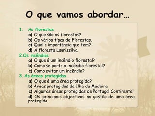 [1] Florestas são ecossistemas com árvores e outros seres vivos que interagem. Existem florestas tropicais, temperadas e boreais. [2] A floresta Laurissilva da Madeira é Património Mundial da UNESCO e abriga espécies como loureiro e til. [3] Incêndios florestais podem ser causados por humanos ou raios, e sua propagação depende de topografia, clima e combustível disponível. É importante evitá-los e proteger as áreas naturais.