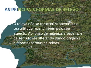 As principais formas de relevo em Portugal Continental incluem montanhas, planaltos, planícies e vales. Montanhas são elevações com grandes desníveis e altitudes acima de 1000 metros. Planaltos são antigas montanhas desgastadas com altitudes acima de 200 metros. Planícies são áreas planas com altitudes abaixo de 200 metros. Vales são zonas baixas entre montanhas onde correm rios.