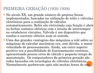 O documento descreve as quatro gerações de computadores desde a primeira geração baseada em válvulas eletrônicas até a quarta geração baseada em circuitos integrados. A segunda geração introduziu transistores e memórias magnéticas. A terceira geração usou circuitos integrados com milhares de transistores em chips de silício. A quarta geração trouxe microprocessadores e microcomputadores como o Apple I e o PC da IBM.