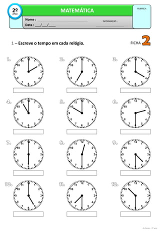 Este documento contém uma ficha de matemática do 2o ano sobre horas. A ficha pede que os alunos escrevam horas em relógios, desenhem a passagem do tempo em um relógio, e calculem horas futuras a partir de um momento inicial.