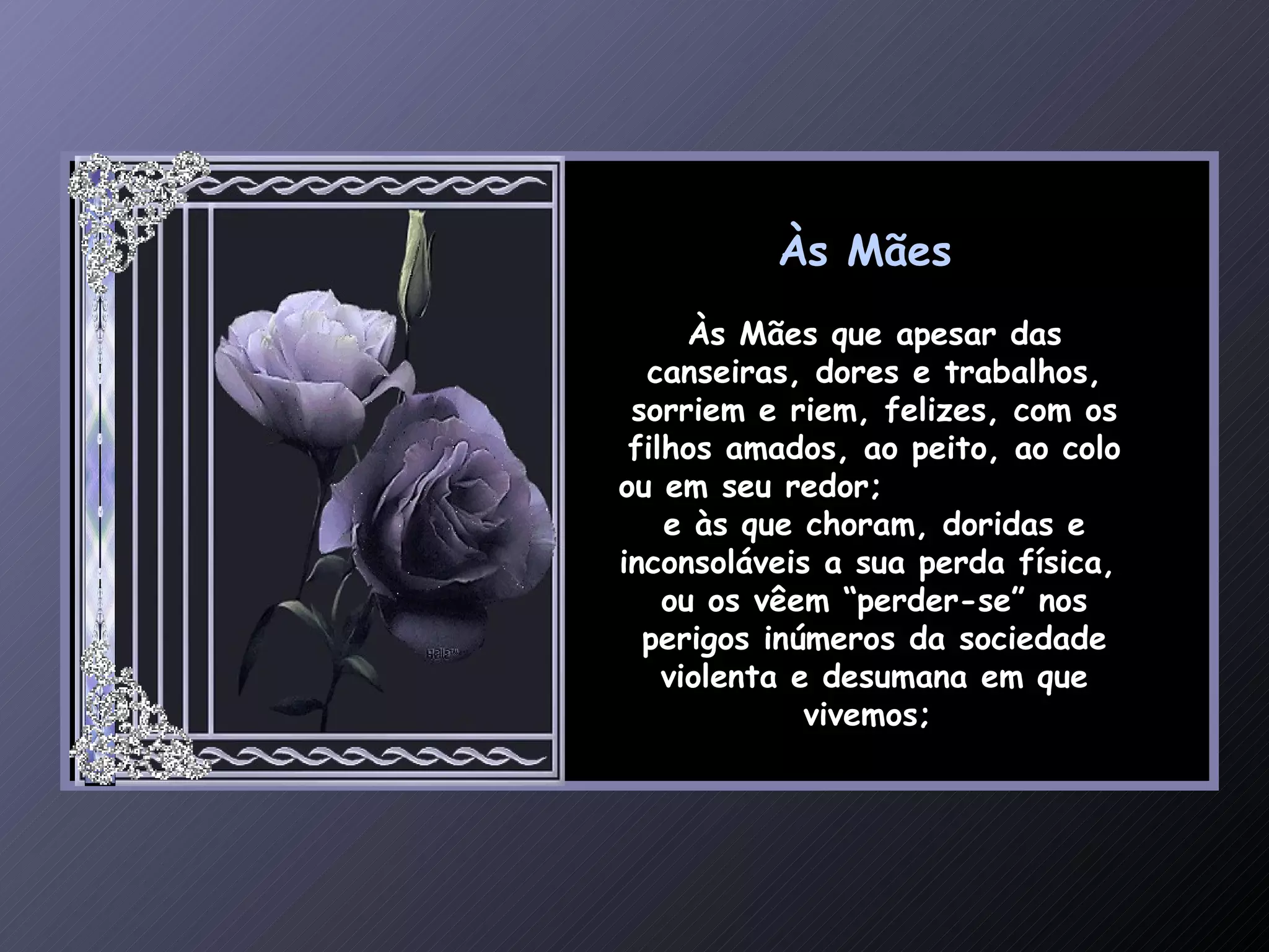 Este documento homenageia todas as mães, independentemente de sua situação, reconhecendo os sacrifícios e dificuldades que enfrentam em sua jornada maternal. Agradecendo a todas as mães por seu trabalho, seja na alegria dos filhos ou na dor de sua perda, e parabenizando-as por seu papel fundamental, mesmo que nem sempre reconhecido.