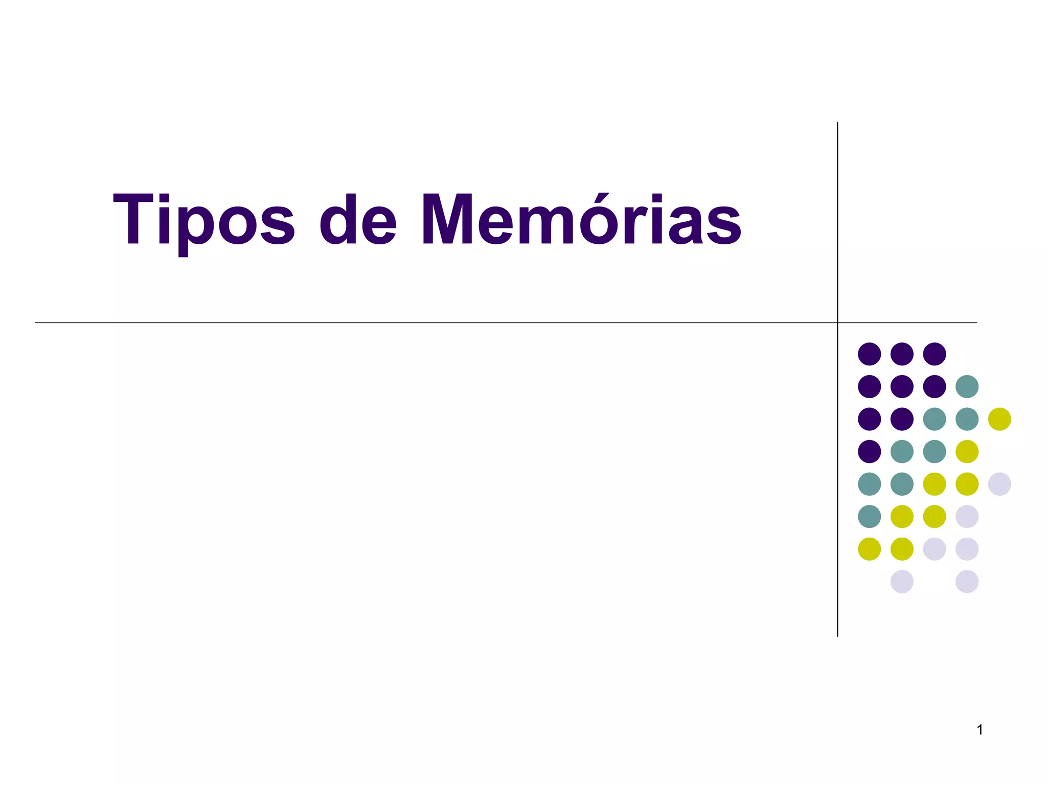 O documento discute os diferentes tipos de memórias, incluindo RAM, ROM, memórias secundárias e suas características. Detalha SRAM, DRAM, ROM, PROM, EPROM, EEPROM e Flash EEPROM e como cada um armazena e recupera dados. Também descreve disquetes, discos rígidos, CDs e fitas magnéticas como memórias secundárias.