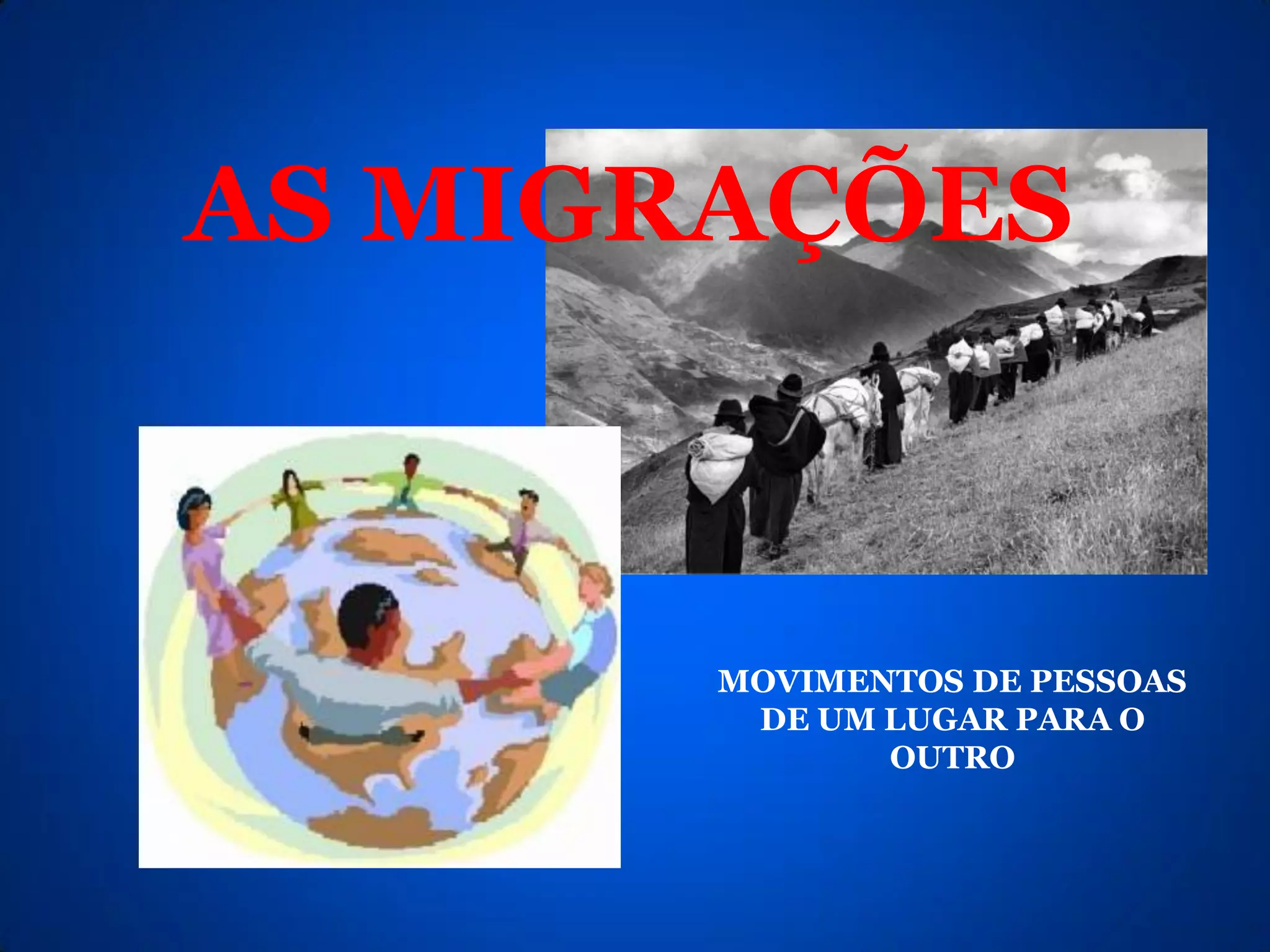 O documento discute os tipos de migrações de acordo com o espaço, duração e forma. Quanto ao espaço, existem migrações externas entre países e internas dentro do mesmo país. Quanto à duração, as migrações podem ser definitivas ou temporárias. Quanto à forma, as migrações podem ser voluntárias, forçadas, legais ou clandestinas.
