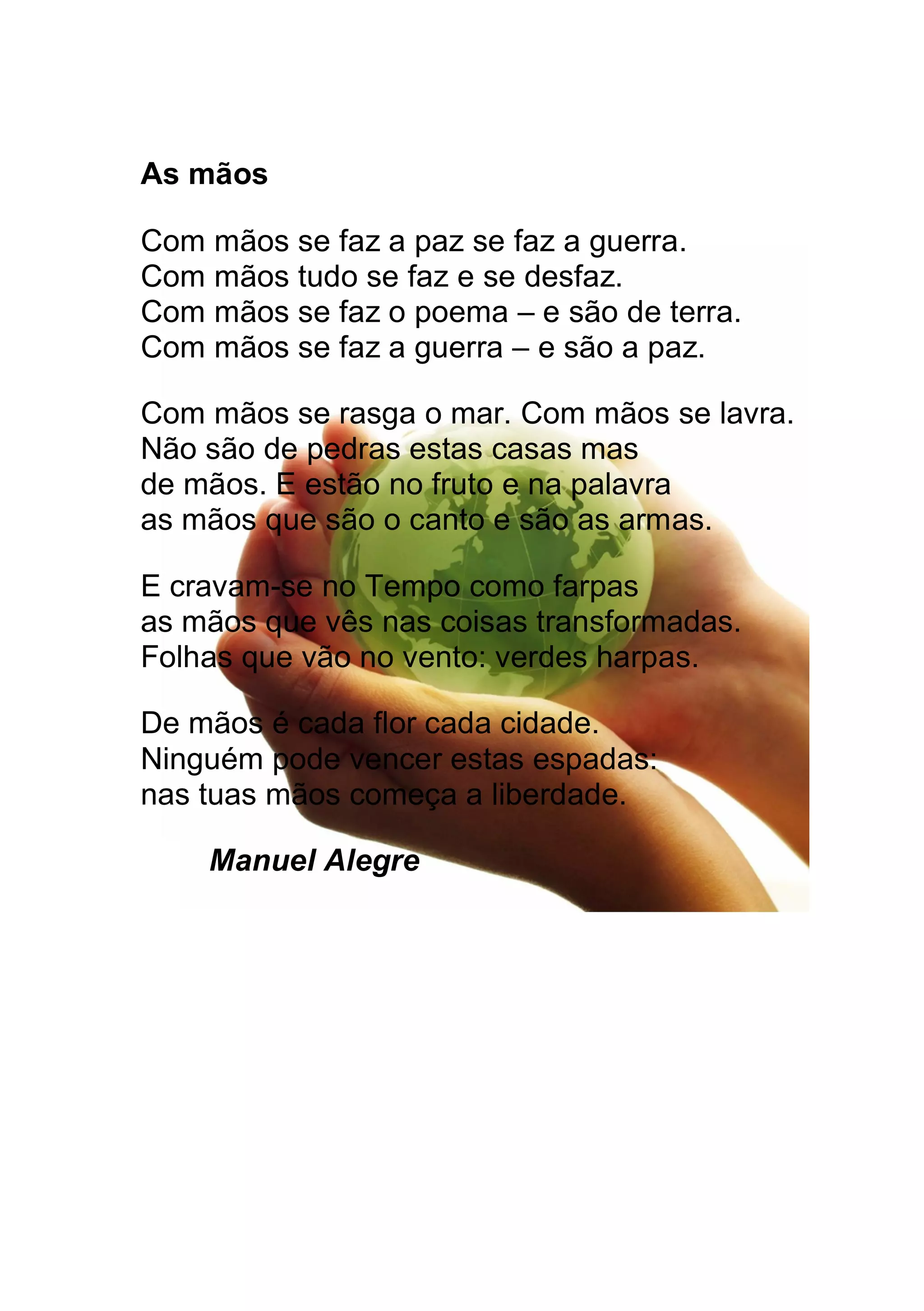 O poema descreve como as mãos são capazes de criar tanto a paz quanto a guerra, e como tudo na vida é feito e transformado pelas mãos do homem, seja poesia, casas, frutos, cidades ou liberdade. As mãos moldam o mundo e ficam gravadas no tempo.