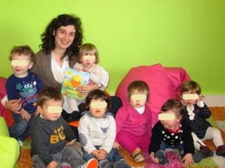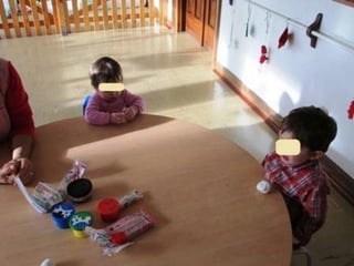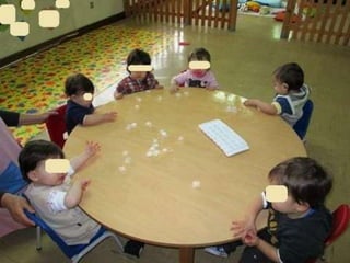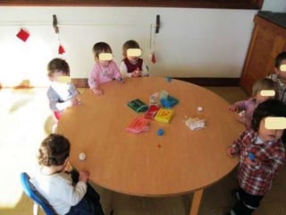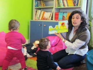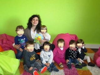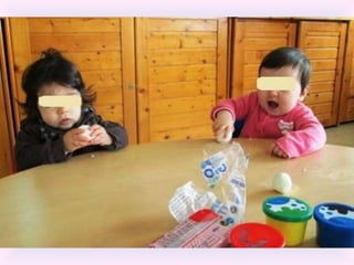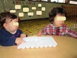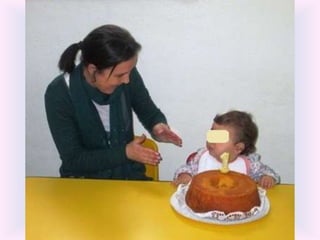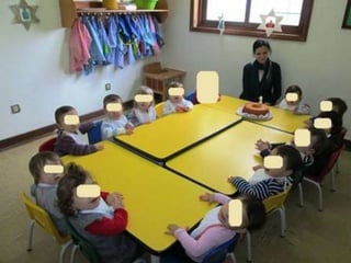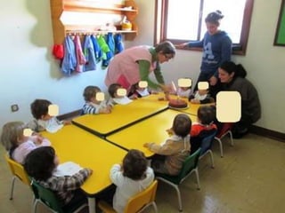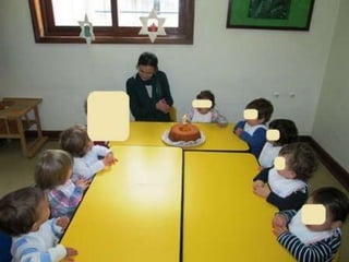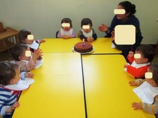 O documento lista eventos e atividades de uma creche, incluindo aniversários de duas meninas, os primeiros passos de duas crianças, uma experiência sensorial com gelo, modelagem com plasticina, a construção de um boneco de neve, e uma mãe contando uma história na biblioteca da creche.