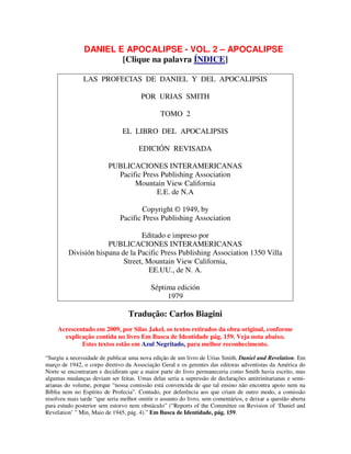 Este documento é um prefácio e índice do livro "Daniel e Apocalipse - Vol. 2 – Apocalipse" de Urias Smith. O prefácio explica que o livro fornece uma interpretação das profecias bíblicas, especialmente à luz dos eventos atuais. O índice lista os 21 capítulos que compõem o livro e fornece breves descrições sobre o conteúdo de cada um.